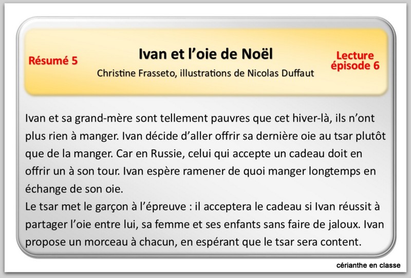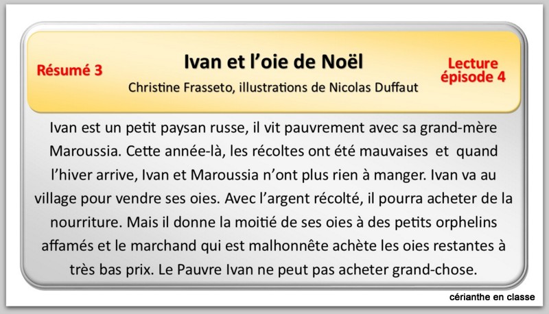 Mais si vous avez déjà de quoi travailler ou si le texte ne correspond pas à votre thème du moment, il vous est possible de l’insérer dans vos ateliers de lecture. (Est-ce que ça se pratique encore dans les classes?) Vous avez ainsi six séances prêtes à l’emploi. L’inconvénient avec les ateliers tournants, c’est évidemment que les élèves ne reviendront à l’histoire qu’au bout d’un certain temps. C’est pourquoi j’ai préparé des fiches-résumés qui aideront à se reconnecter à l’histoire. (Voir ci-dessous)
