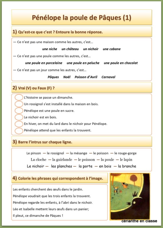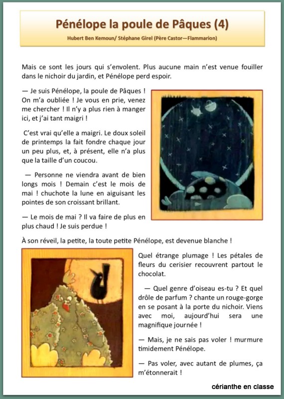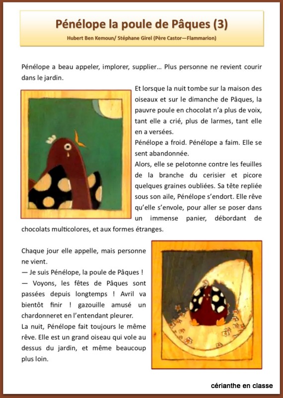 Vous connaissez certainement la belle histoire de Pénélope la poule de Pâques. Je vous propose de travailler ce conte poétique sous forme de lecture suivie, avec le texte découpé en six épisodes accompagné de fiches d’exercices, une série pour les CE1 et une dédiée aux CP.
