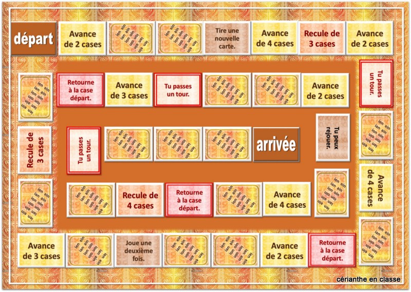 Pour jouer, vous aurez besoin de la piste, à photocopier en A3, et de la série de cartes présentées plus bas. Pas besoin de dé car ce sont les cartes qui indiquent de combien de cases le joueur peut avancer, s’il répond correctement à la consigne.